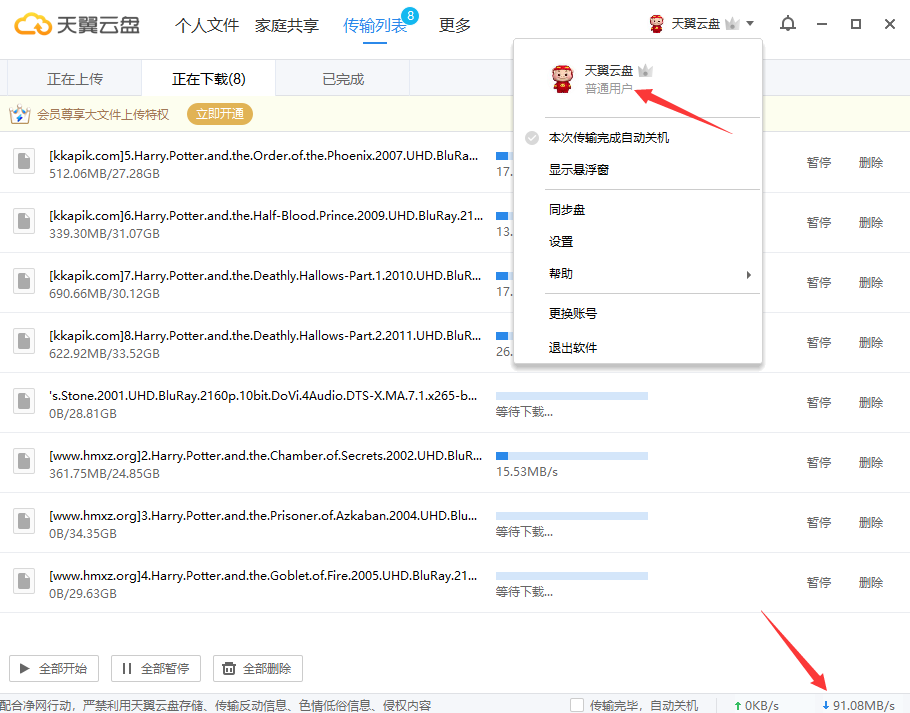 还行吧,我这边同时下载5个,速度能上90MB/秒,而且是没开云盘会员。下载的是这个合集的哈利波特。