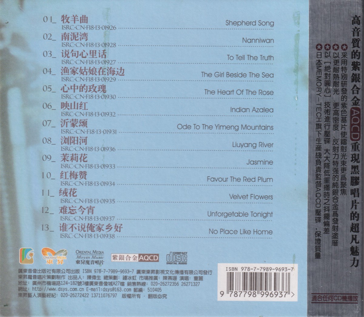 01.牧羊曲02.南泥湾03.说句心里话04.渔家姑娘在海边05.心中的玫瑰06.映山红07.沂蒙颂08.浏阳河09.茉莉花10.红梅赞11.绒花12.难忘今宵13.谁不说俺家乡好