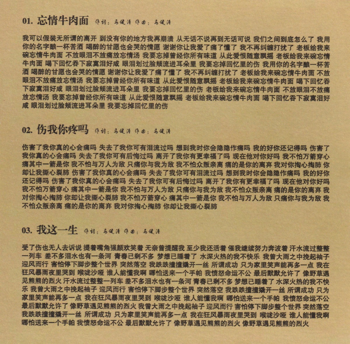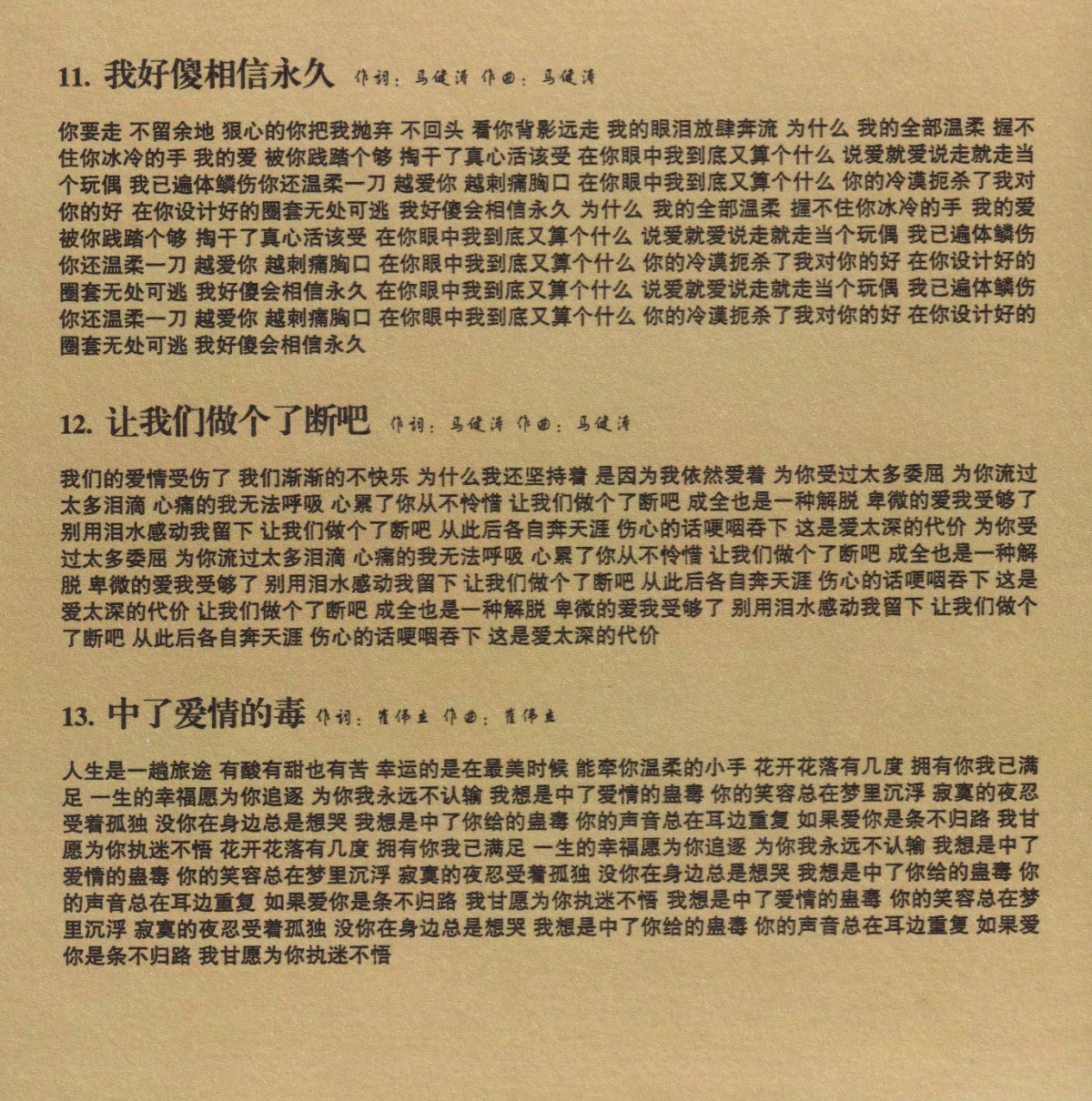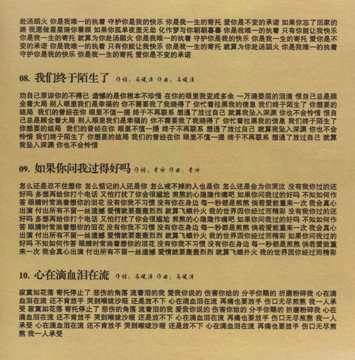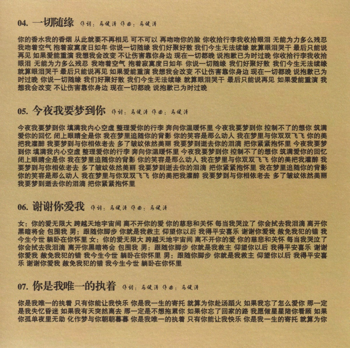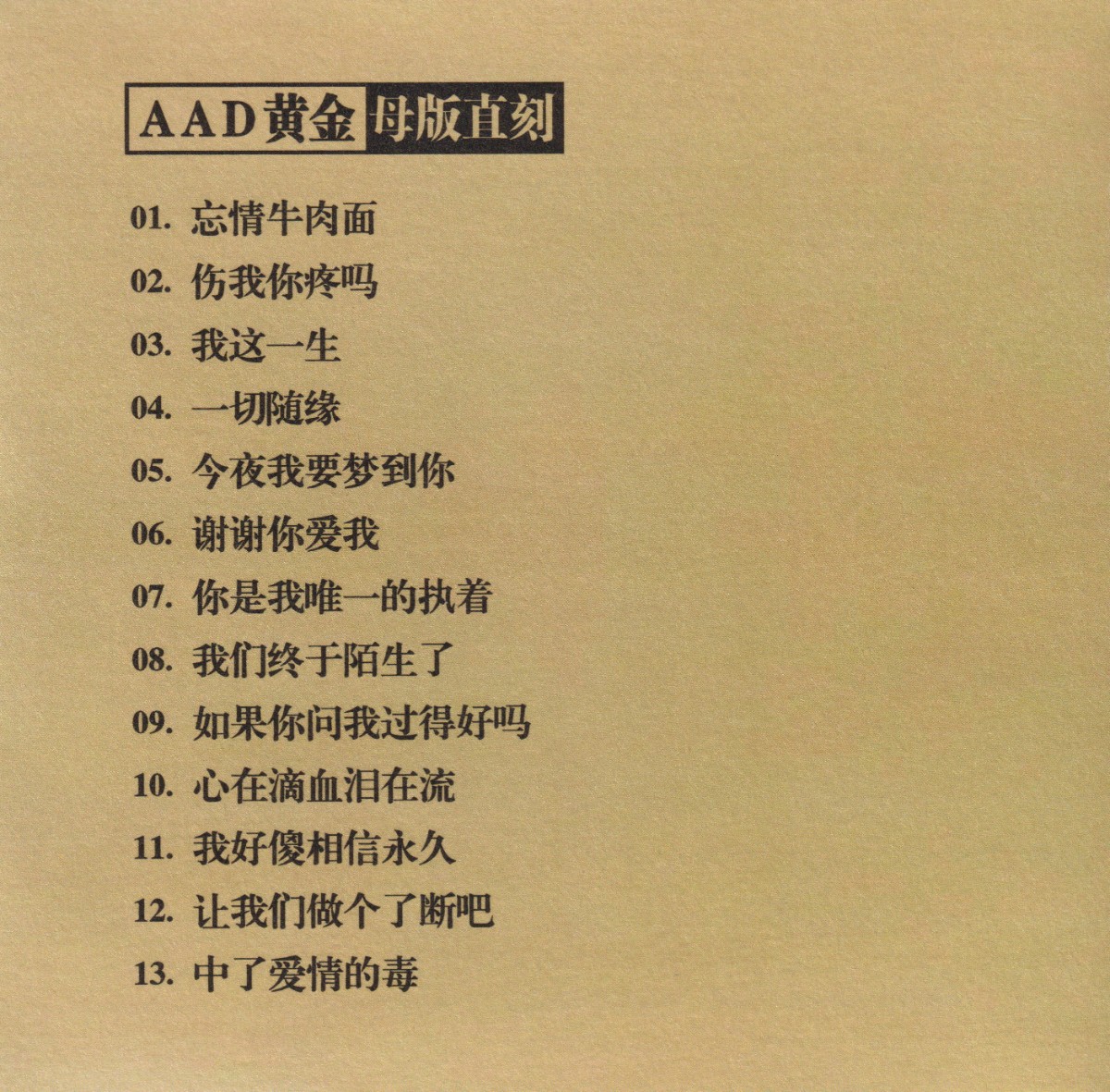 01.忘情牛肉面02.伤我你疼吗03.我这一生04.一切随缘05.今夜我要梦到你06.谢谢你爱我 07.你是我唯一的执着08.我们终于陌生了09.如果你问我过得好吗10.心在滴血泪在流11.我好傻相信永久12.让我们做个了断吧13.中了爱情的毒