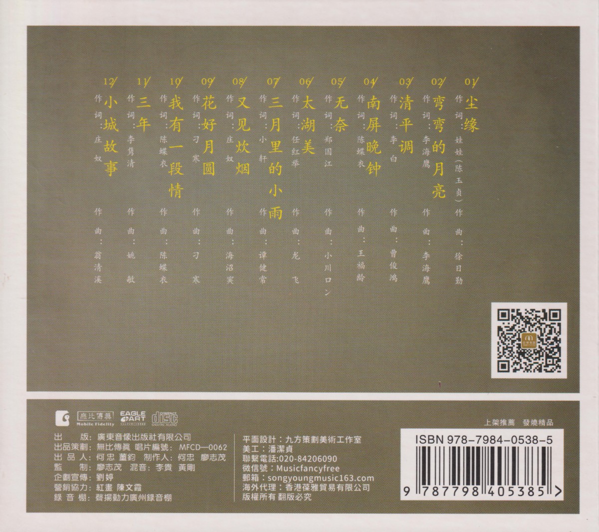 整个专辑崇尚江南小调风格,包括《清平调》、《弯弯的月亮》、《南屏晚钟》、《三月里的小雨》、《小城故事》等12首全新编曲歌曲,在录音、配乐、编曲和唱腔方面都是HIFI大碟的典范之作。