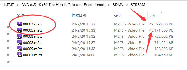 进入下面路径BDMV\STREAM,接着切换文件大小排序,最大的两个文件就是两个影片主体