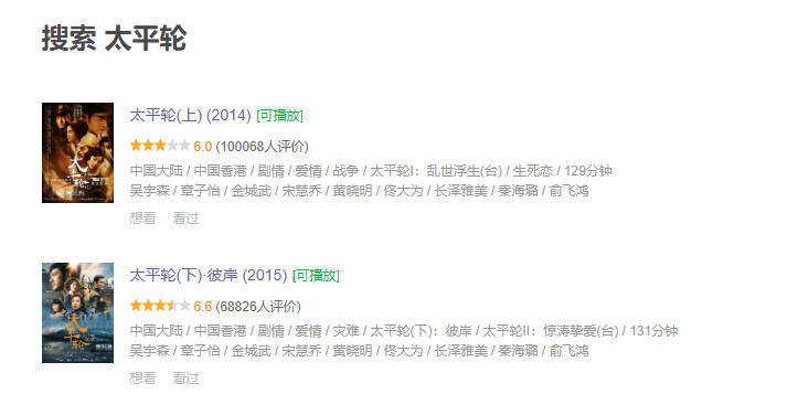 豆瓣词条名:太平轮(上) (2014) / 太平轮(下)·彼岸 (2015)